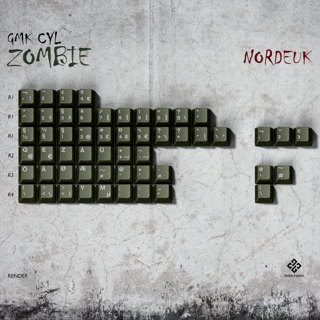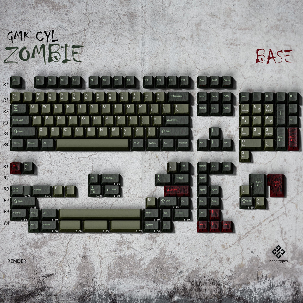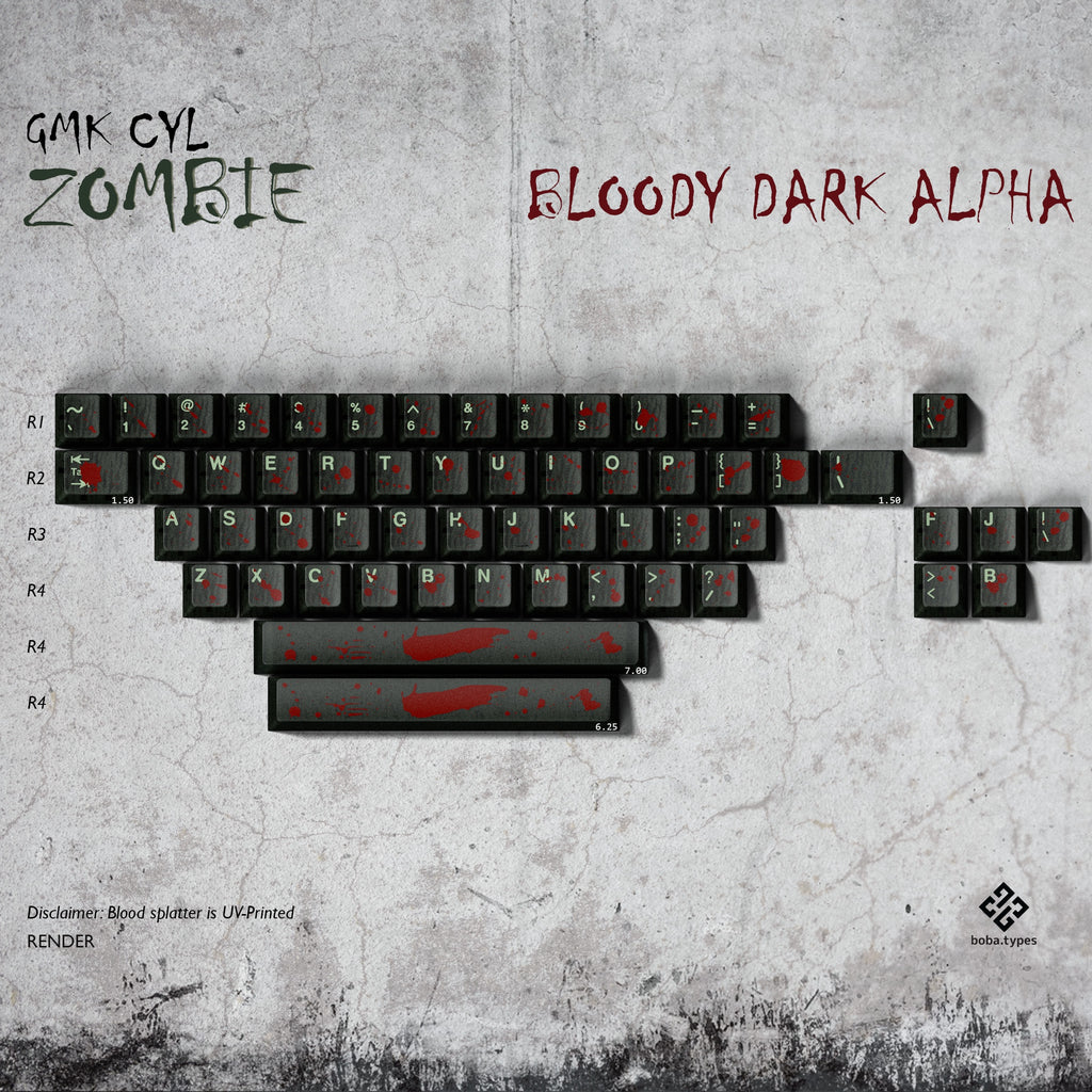 The keycaps here are semi-translucent sickly green, with a sinister-looking inner shell semi-visible through the murky outer layer. The novelties feature various rotting body parts that are double-shot with UV-print elements to add details like blood, eyeball sclera, exposed bone and teeth. Weapons to survive the apocalypse are included too.